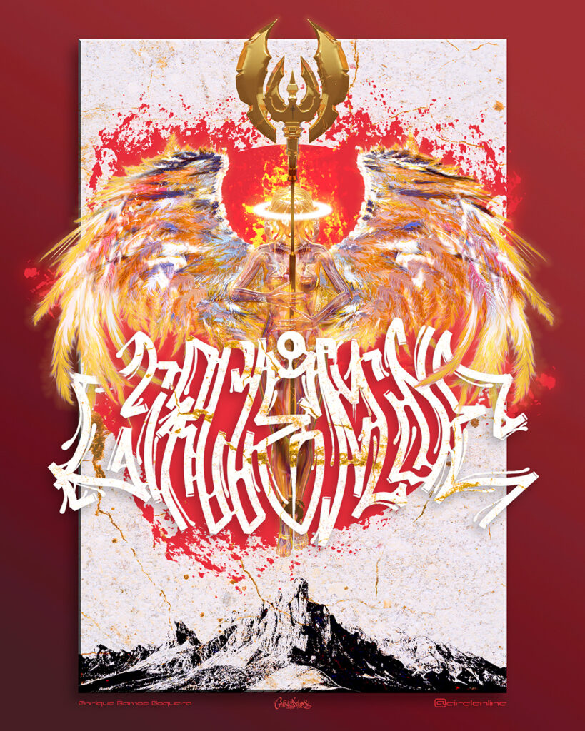 Approaching the project leading to an album cover style, I took inspiration from symmetrical metal band logos to create this one with my own touch. The main character is a golden angel created using Daz 3D and Blender. Everything except for the base Daz3D woman model is made from scratch by me, using Blender for modeling and Photoshop for image editing and composting.
